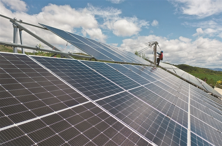 國網(wǎng)天鎮(zhèn)縣供電公司太行黎明共產(chǎn)黨員服務(wù)隊隊員在谷前堡鎮(zhèn)白羊口村對分布式屋頂光伏進行隱患排查。
